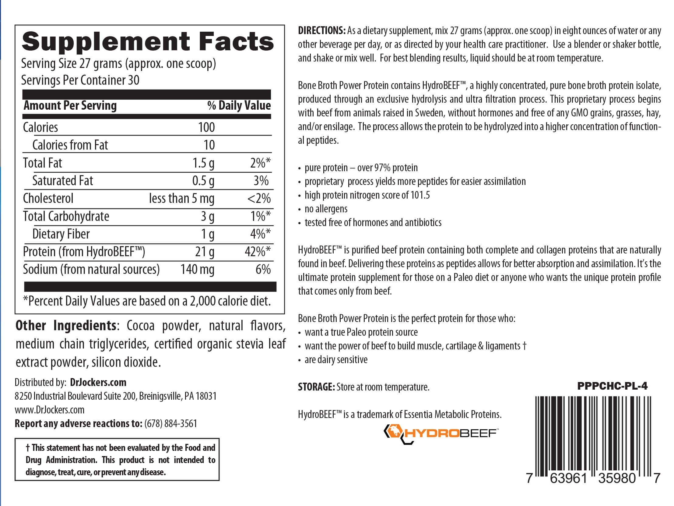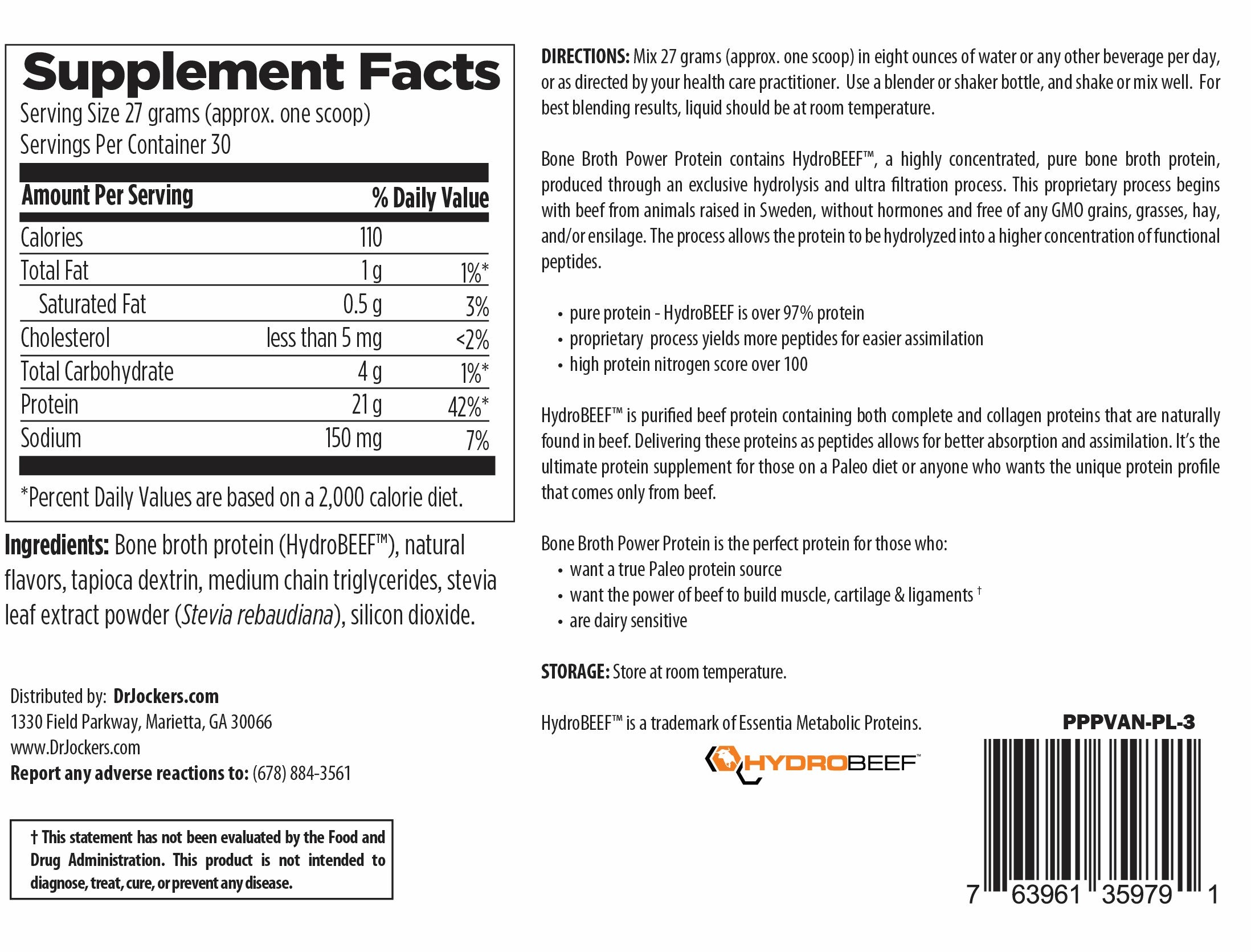 Bone Broth Power Protein contains 21g of the concentrated protein isolate HydroBeef™. A proprietary process allows for the peptides in this protein to become easily assimilated and absorbed.