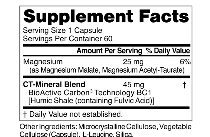 A variety of naturally occurring trace minerals derived from fulvic acid, magnesium malate, and magnesium acetyl taurate.