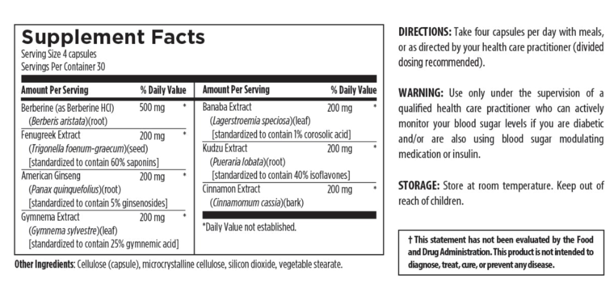 This unique, synergistic formula combines standardized herbs and other botanicals that are shown to support healthy blood sugar through various mechanisms, including cinnamon, corosolic acid from banaba, isoflavones from kudzu, and ginsenosides from ginseng.